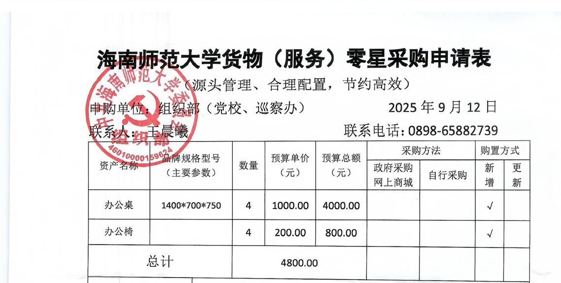 因工作需要,特申请购置4张办公桌,4把办公椅,根据学校相关规定,对购置物品明细公示如下,公示时间2025年9月12日至2025年9月16日,如有疑义,请致电0898-65882739。特此公示。